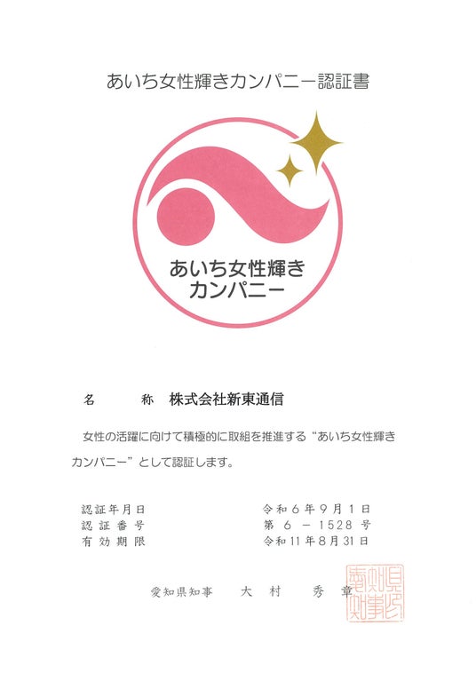 株式会社新東通信(本社:東京都中央区、愛知県名古屋市 代表取締役社長 谷 鉃也 以下、新東通信)は、2024年9月に愛知県の「あいち女性輝きカンパニー認証制度」において、女性の活躍促進に取り組む企業として「あいち女性輝きカンパニー」認証を取得しました。