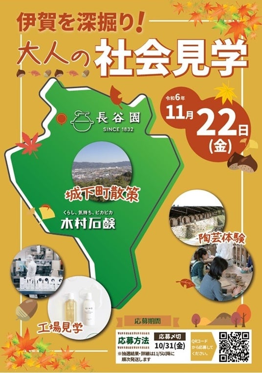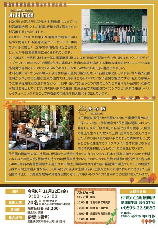 11/22(金)開催!バスで巡る大人の社会見学。伊賀の歴史・伝統・風情・ものづくりを体感できる唯一無二のイベントです。木村石鹸では、今年で創業100年を迎えた石鹸メーカーの伝統的な技法「釜焚き製法」などのものづくりを見学。江戸後期の天保3年に開窯した長谷園では、伝統と技術を継承した伊賀焼の陶芸を体験できます。