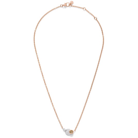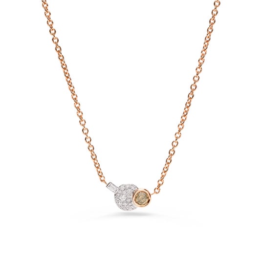 ペンダントには、ブラウンダイヤモンドのソリテールがダイヤモンドパヴェセッティングされたディスクの上に据えられ、さらにバゲットカットのホワイトダイヤモンドがこのエレガントなデザインに輝きを添えています。このすべてがローズゴールドで仕上げられています。さまざまなサイズやカットのダイヤモンドを精緻に手作業でセットすることで実現されるのは、伝統的な職人技と最新のデザインが見事に融合した逸品です。ローズゴールドチェーンに吊り下げられたペンダントは、さまざまな長さで着用することができます。