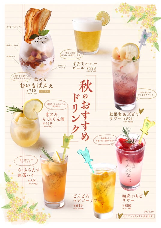今年の新作となる、食後のデザートとしてもお楽しみいただける「飲めるおいもぱふぇ」や3種類の果実のハーモニーが楽しめる「秋果実&ぶどうサワー」をはじめ、秋に楽しんでいただきたい、カラフルでかわいいドリンク7種をご用意しています。