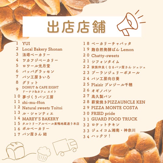 地元藤沢や湘南エリアのベーカリーはもちろん、横浜や相模原の名店も出店します。