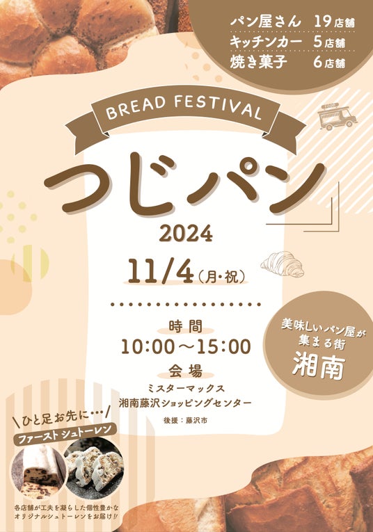 湘南パン祭り実行委員会(実行委員長:齋藤 孝曉)が、神奈川県藤沢市・MrMax湘南藤沢ショッピングセンターにて、2024年11月4日(月・祝)につじパンを開催いたします。藤沢・茅ヶ崎をはじめとする湘南エリアのベーカリーを中心に、キッチンカーや焼き菓子屋の出店など計30店舗が集まるパン祭りです。