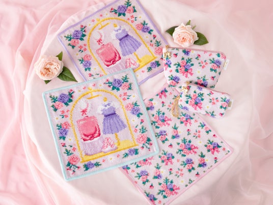 第2弾となる今回は、心躍るオリジナルデザインの2柄が加わりました。griroseのお店をモチーフにした「マイリトルブティック」柄はハンカチ2色を展開、バラの花を愛らしいブーケにした「スウィートブーケ」柄はハンカチ1種類、ポーチ2種類で、全5アイテムを展開します。