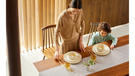 本コレクションのテーマは、「Resonating with the depth of time ~時の厚みに共鳴して~」。クラシックなものを受け継ぎ、現代も使い続ける英国アンティーク陶器を着想源に、幾何学模様のオリジナル柄のランチョンマット、ランナー、ギフトセットが登場します。