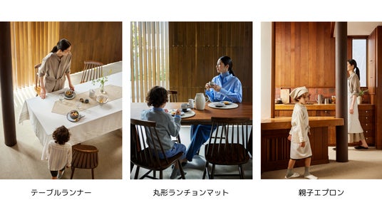 時短に簡単素敵にテーブルコーディネートが完成するギフトセットや茶道の世界にインスパイアされた新アイテム(茶碗袋、茶杓袋、へだて等)、親子でペアルックができる大人用・子供用のエプロンが新登場。