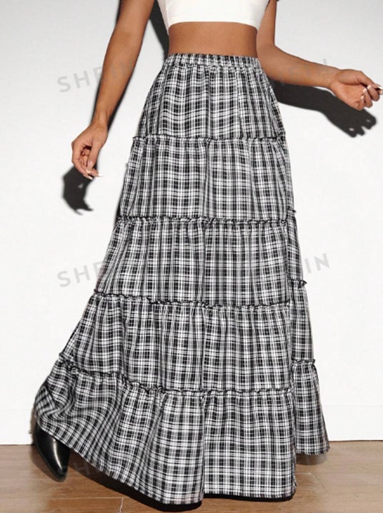 商品名:SHEIN MOOSTA 女性用チェック柄プリントフリルヘムハイスリットスカート
