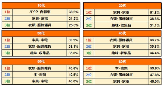 各世代で衣類や家具など自宅で収納がしきれないものが中心となりましたが、年代別の特徴として、10代の利用者では唯一「バイク・自転車」を最も多く選んでいる点や、50代~60代では「本・書類」が上位に挙げられ、特に60代では5割を超えました。