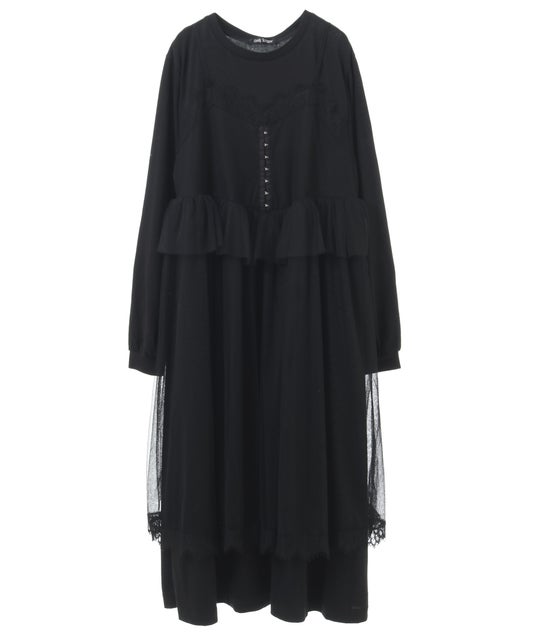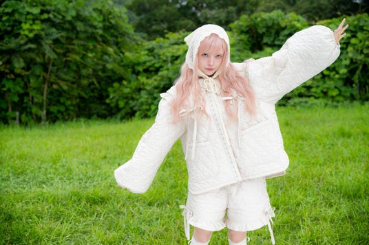 今回のコレクションではガーリーなムードから着想を得た全部7型のアイテムをラインナップ。リボン付きのビッグカラーや細部のディティール使い目が惹くキルティングのセットアップ ダスティーカラーのスウェット素材を用いることで甘さを抑えたセットアップ1枚でスタイリングが完成するランジェリーディティールのレイヤードワンピース スタイリングのアクセントに最適なバブーシュカやロゴ入りのシアーハイソックスなどコラボレーションならではのスペシャルなアイテムに仕上がりました。