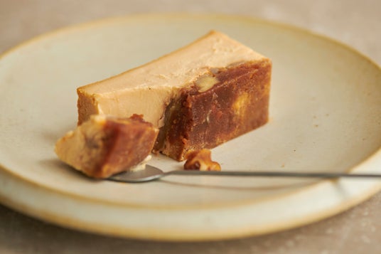 そして、クルミッ子らしさをより感じていただけるように、今回Mr. CHEESECAKEで初めて、ケーキの底にボトム生地を敷いています。ボトム生地は、食感が残るように浅めにローストしたクルミと、ガレットブルトンヌというバターを贅沢に使用したフランス伝統のクッキーを手作りし、そこへ生キャラメルを組み合わせ、クルミッ子を彷彿とさせるような味わいに仕上げました。クルミ、クッキー、生キャラメルで全体の味わいのバランスをまとめたボトム生地に、チーズケーキの生地を流して焼き上げることで、クッキーの食感が程良くしっとりとし、ボトム生地に一体感が生まれます。