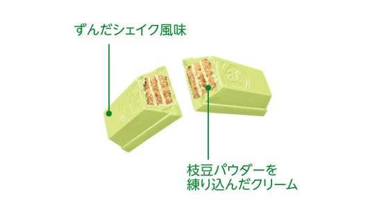 ウエハースの間のサンドクリームに枝豆パウダーを練り込み、「ずんだシェイク」風味の生地で包み込むことで「ずんだシェイク」ならではの味わいを再現しました。