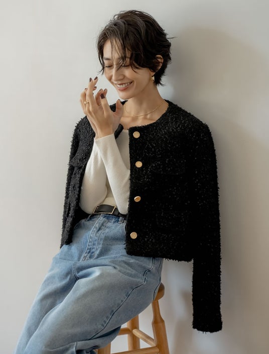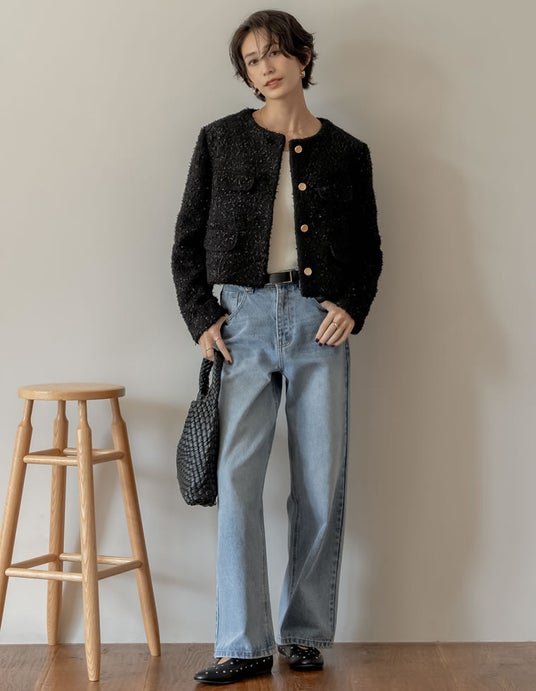 レトロでレディライクなゴールド釦のジャケットを主役に、ラフにデニムを合わせたスタイリング。