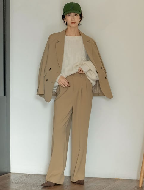 端正なジャケット×パンツのセットアップを上品にカジュアルダウン。