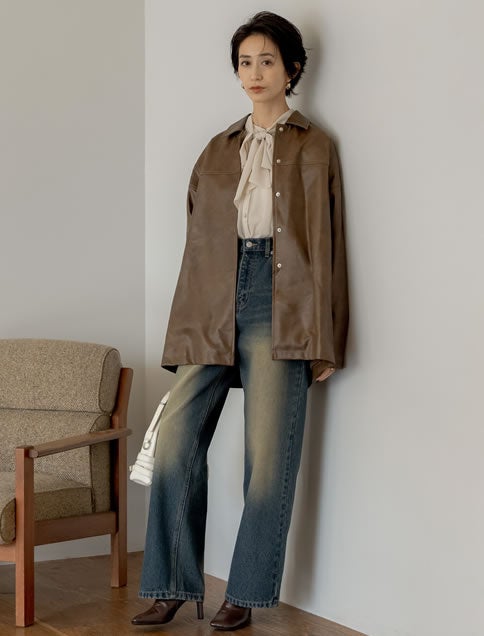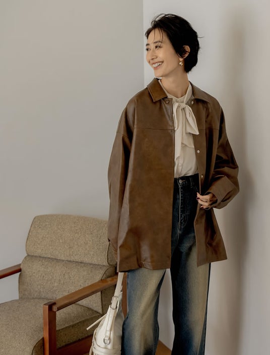 ヴィンテージ感のあるオーバーサイズのレザージャケットをモードに着こなすのが今っぽい。