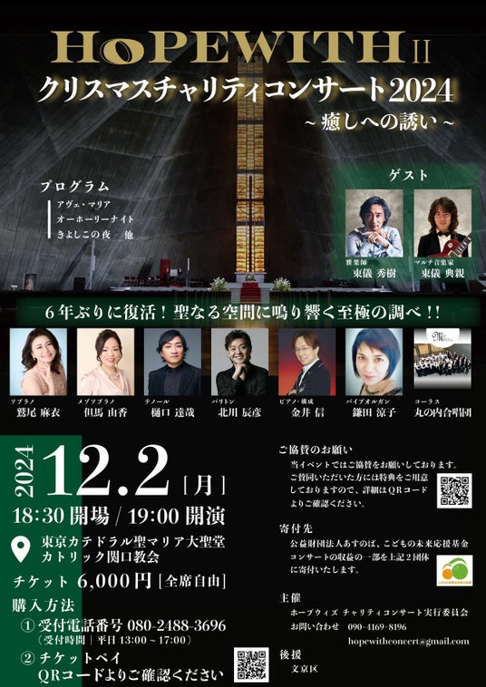 「チケットペイ」は、2024年12月2日(月)に東京カテドラル聖マリア大聖堂・カトリック関口教会にて開催される『HOPE WITHII クリスマスチャリティコンサート』のチケット販売を開始いたします