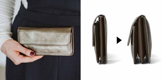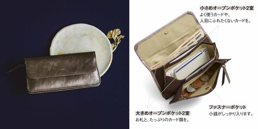 月の輝きをイメージしたブロンズカラーが大人の趣。ぴたりと手に吸い付くような質感が心地よい、きめ細かな国産のカーフレザーを使ったフラップ型の長財布です。5部屋構造で中を見渡しやすく、カードやレシートもざっくりと仕分けが可能。よく使うカードは定位置のポケットに収めて、さっと出し入れ。内側は月光のようなゴールドカラーで、中身も見やすくしています。
