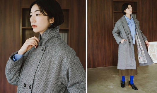 中わた入りで軽やかなのに暖かく、きちんと見えて、衿を立てると首もとまで包まれてマフラーいらずのジャケットコートです。綿100%のミニマムギンガムチェック生地は、起毛素材で肌心地がよく、裏地には、山本祐布子〈mitosaya 薬草園蒸留所 代表取締役/イラストレーター〉描き下ろしの水彩で描いたバラの実をプリントしています。ふと目に映る華やかな柄ゆきが、冬の装いを心うれしい気分へ引き立ててくれます。