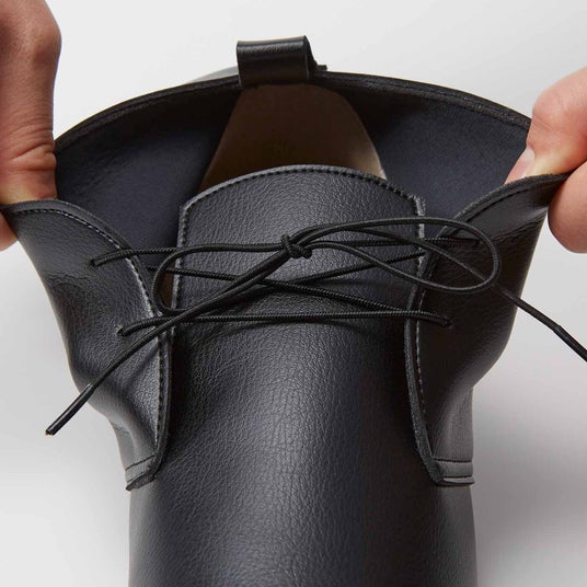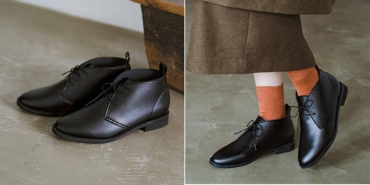 砂漠を歩くイギリス陸軍士官らの靴が起源とされるデザートブーツ。ほどよい丈や靴ひもデザインを踏襲しつつ、より快適な工夫を盛り込んでいます。神戸・長田の靴職人さんが修正を重ね、理想の靴を追求するていねいな姿勢は、シルエットの美しさや履き心地のやさしさにも表れます。端正な趣とともにお出かけを愉(たの)しくしてくれる一足。本革見えする大人な印象のフェイクレザーはお手入れも簡単です。