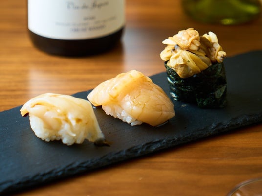 腕利きの職人が握るホタテとつぶ貝、アサリの軍艦巻き。濃厚な貝の旨みには、辛口な白の日本ワインを合わせて。