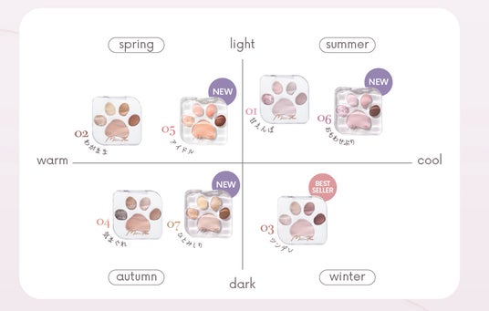 2024年2月21日に販売を開始した「ミャオパウズアイシャドウパレット」は、その見た目の通り猫の肉球をモチーフとしたアイシャドウパレットです。全4色展開で、それぞれ「わがまま」「ツンデレ」など猫の性格をイメージした色合いやカラー名がつけられております。洗練された商品コンセプトと可愛らしいパステルカラーの見た目、使いやすい発色とテクスチャーなどがご好評をいただき、多くの方にご愛用をいただいております。