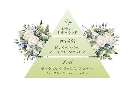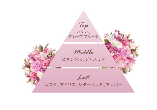 豪華絢爛なヴェルサイユ宮殿をイメージした香り。華やかさのあるフルーティな香りから、パウダリックなほんのり甘く落ち着いた香りに移り変わります。