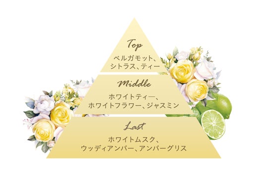 バリのカフェでのティータイムをイメージした香り。ベルガモット、ティー、シトラスといったフレッシュな香りから、ホワイトフラワー、ホワイトムスクの温かみのある上品な香りに移り変わります。