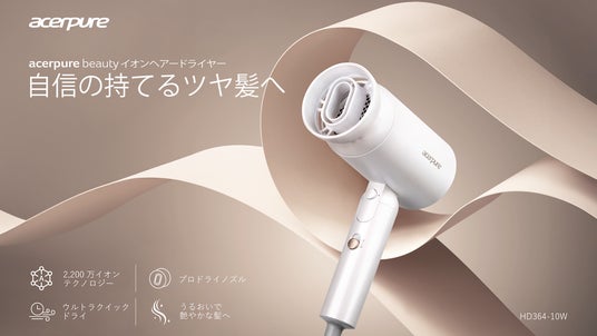 日本エイサー株式会社(本社:東京都新宿区、代表取締役社長:ボブ・セン)は、空気清浄機で高い評価を得ている Acerpure より、Acerpure Beauty イオンドライヤー 2モデル 「DS744-10W」と「HD364-10W」を発売致しました。 AIイオンドライヤー 「DS744-10W」は、わずか400gの軽量ボディに、7種のアタッチメントやAIモードなど、多彩な機能を搭載。髪質やスタイリングの目的に合わせて最適な風量と温度を自動調整し、サロン帰りのようなスタイリングを実現します。また、「HD364-10W」は、シンプルかつエレガントなデザインで、2200万個のマイナスイオンが髪に潤いを与えながら素早く乾かし、まとまりのある美しい髪へと導きます。
