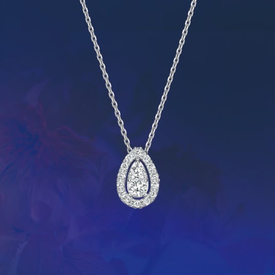 センターに輝く2石のダイヤモンドがまるで1粒の雫のようにきらめき、その周りを取り巻くメレダイヤモンドが、20周年にふさわしい輝きを添えます。ベーシックでエレガントに仕立てたネックレスです。