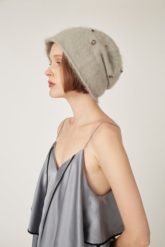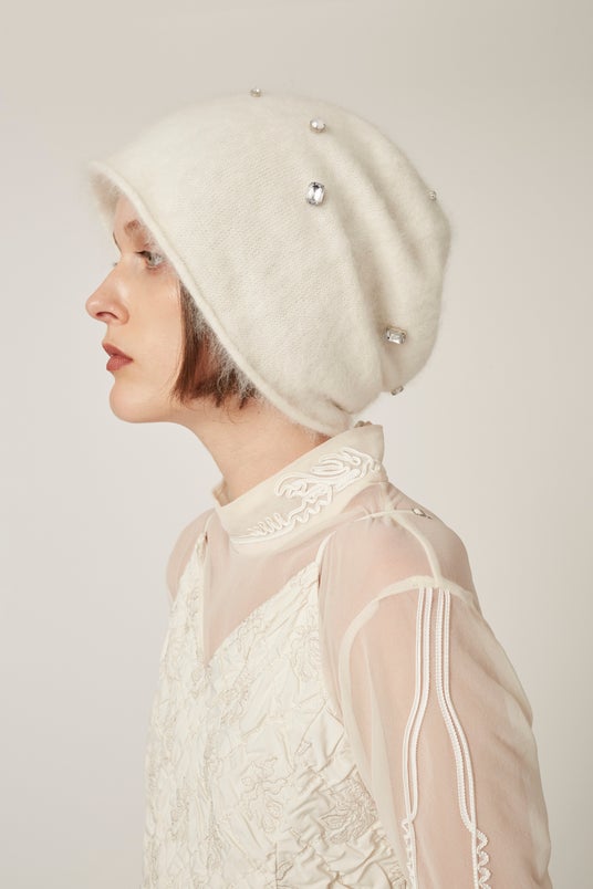 夜の穏やかな時間を表現したアンゴラ混のニットワッチ。ミンク加工により、ふわふわとした毛足が優しく包み込む表情を演出します。ビジュー付きのタイプと、ビジューなしのタイプの2パターンのデザインを展開いたします。キラキラと輝くビジューはデザイナーが夜に見た、まるで宝石のような景色から着想を得ています。粗目のゲージで編まれたゆったりとしたサイズ感と、裾をそのままでも折り返しても着用できる仕様により、スタイリング次第で様々なスタイルを楽しめる汎用性の高いアイテムです。
