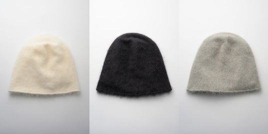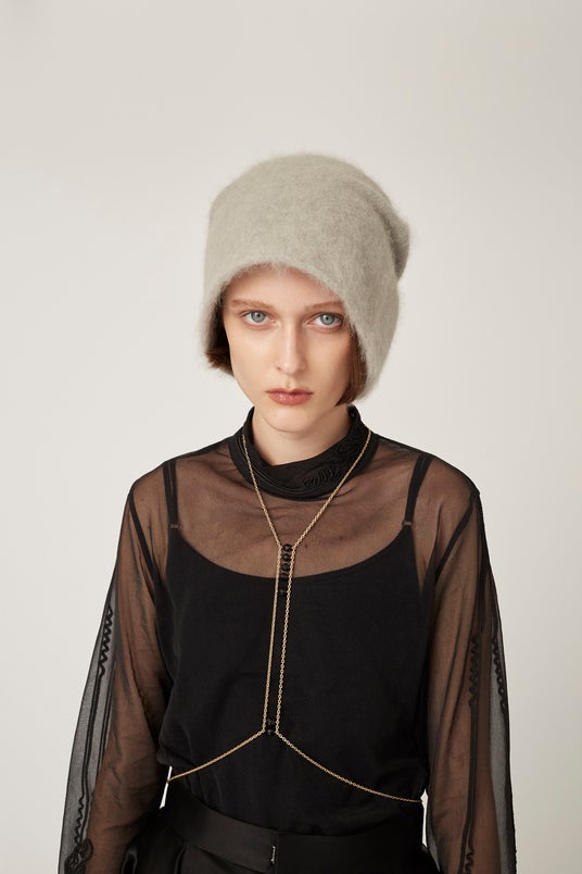 「ハイゲージのアンゴラ糸を一重仕立てで柔らかく編んだ後に起毛加工をかけてふわふわに仕上げたニットワッチは染色から行いオリジナルカラーに仕上げています。締め付けのないたっぷりとしたサイズ感と深めのシルエットが特徴です。目深に被りフードのように合わせると優しく頭を包み込みます。浅めに被り後ろのたるみを出して合わせたり、折り返して被ったりと、被り方次第でムードを変えることができます。