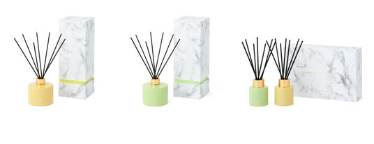 スイーツを楽しむ時間と空間を贅沢に演出するフレグランスディフューザーです。シトラスとカシスの香りをベースに瑞々しいフルーツの香りが特徴の「リフレッシュフルーツ」、グリーンティーの香りをベースにした「リラックスグリーン」をラインアップしました。シンプルで上品なボトルのデザインはどんなインテリアにも馴染みます。ミニサイズのセットはクリスマスギフトにもおすすめです。