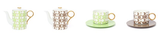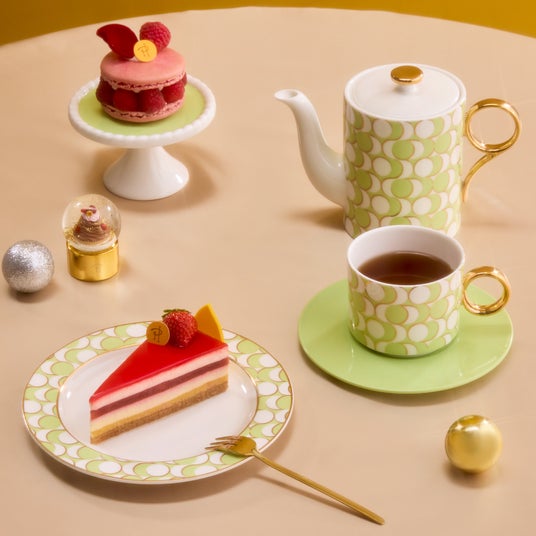 ピエール・エルメ・パリのスイーツをおうちで楽しめるティーポットとカップ&ソーサーです。ピエール・エルメ・パリを代表するマカロンの色から着想を得た、ピスタチオグリーンとショコラをイメージし、モダンで洗練された形状が特徴的です。マカロンのシルエットをイメージしたパターン柄に金箔を施した高級感のあるデザインが魅力です。