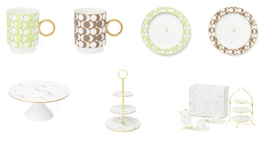 ピエール・エルメ・パリのスイーツをおうちで楽しめるケーキスタンドとアフターヌーンティーセットです。旗艦店であるピエール・エルメ・パリ青山のブティックイメージである大理石柄を取り入れ、洗練されたシルエットで高級感とモダン感を表現しました。ピエール・エルメ・パリのホールケーキがピッタリのるサイズのケーキスタンド、ティーパーティーにおすすめのケーキスタンド3段や、プレート、カトラリー、マグカップ、ティーポット、スタンドがセットになったアフターヌーンティーセットをラインアップしました。アフターヌーンティーセットの長方形のソーサーは、カップの横にマカロンを2個おけるサイズです。