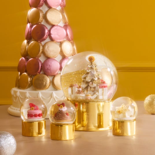 ピエール・エルメ・パリを代表するパティスリーをモチーフにしたスノードームです。シンプルながらも高級感を感じるモダンなデザインが魅力です。Lサイズはクリスマスツリーの周りにケーキやプレゼントが並び、中に入りたくなるような夢のあるデザインです。今回のコラボレーションアイテムであるマカロンスタンドも入っているのがポイントです。
