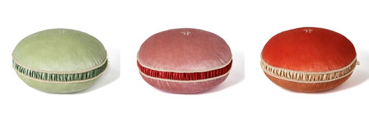 ピエール・エルメ・パリを代表するマカロンをデザインに落とし込んだインテリアクッションです。高級感のあるベルベット調の生地にロゴを刺繍しており、クリーム部分をギャザー加工とゴールドのロープで表現した上品なアイテムです。グリーンはピスタチオ、ピンクはローズ、オレンジはアプリコットのマカロンカラーを再現しています。