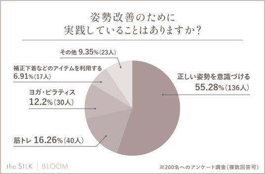 女性200名に姿勢を改善するために何をしているかを調査したところ、「正しい姿勢を意識づける」が半数以上と多い傾向でした。