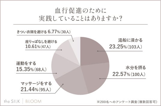 血行を良くするために実践していることを調査したところ、「湯船に浸かる」「水分を摂る」が僅差となりました。