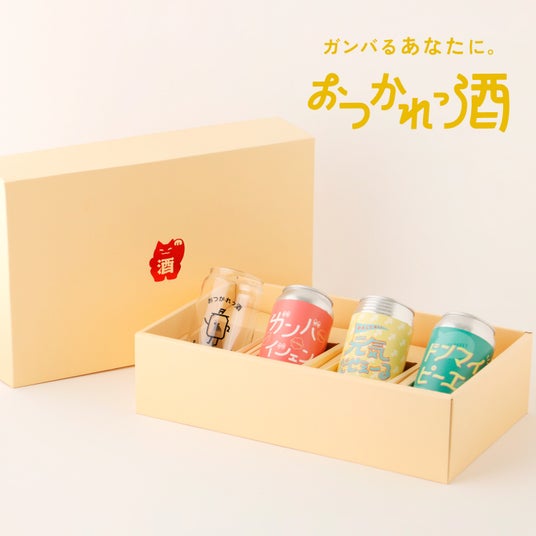 【おつかれっ酒ボックス】「おつかれっ酒」と「おつかれっ酒 ビール缶グラス」を詰め込んだ特製セットです。自分用はもちろん、「おつかれ」を言いたい人へのプレゼントなどにもおすすめです。また、プラス660円(税込)で特製ギフトボックスに入れてお届けします。