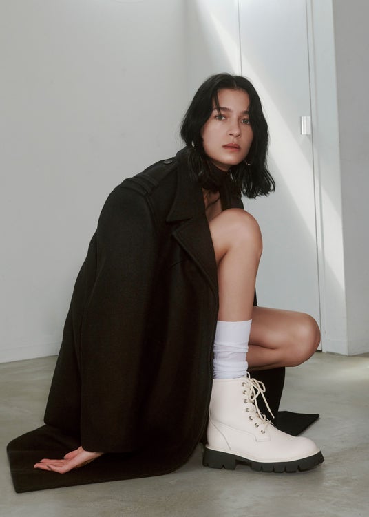 暗くなりがちな冬のコーディネートには、足元明るくホワイトを差し色に。