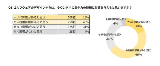 また、同じく普段着よりも明るい色や柄のものを選ぶと答えた566名に対し【Q3】ゴルフウェアのデザインや色は、ラウンド中の集中力の持続に影響を与えると思いますか?と尋ねたところ、65%の方が「大いに影響がある」または「ある程度影響がある」と回答しました。