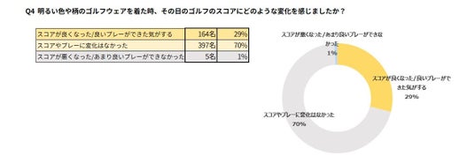 さらに、【Q4】明るい色や柄のゴルフウェアを着た時、その日のゴルフのスコアにどのような変化を感じましたか?という質問では、4人に1人が「スコアが良くなった/良いプレーができた気がする」と答えています。このように、実際に多くのゴルファーが、明るい色のゴルフウェアによって気分が高揚したり、集中力の持続を実感しており、中にはプレーに好影響があると感じている人がいることが明らかになりました。