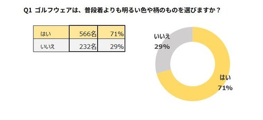 まず、【Q1】ゴルフウェアは、普段着よりも明るい色や柄のものを選びますか?という質問に対し、71%が「はい」と答えており、7割を超えるゴルファーが、普段着よりも明るい色のゴルフウェアを選んでいることがわかりました。さらに、「はい」と回答した566名に【Q2】普段着より明るい色や柄のゴルフウェアを選ぶ理由を尋ねたところ、最も多かった回答は「自分の気分を高めたい」(349名)で、約6割の方が理由に挙げています。次いで「普段は避けがちでも、ゴルフ場なら気にならない」(348名)、「服装の個性を表現したい」(192名)などの答えがつづいています。