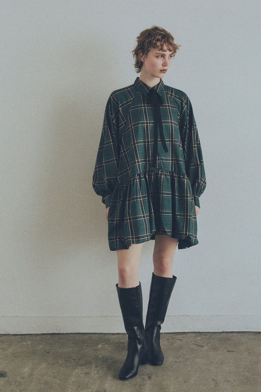 ボウタイリボン付裾バルーンシャツワンピース(¥7,700)