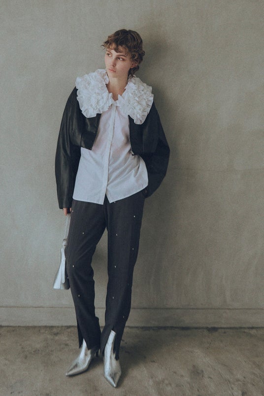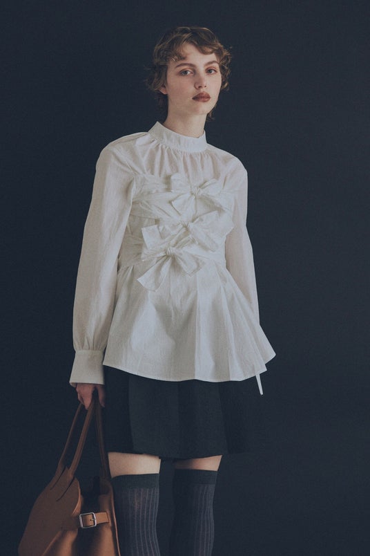 またトップスでは、3連リボンを施したブラウスや胸元のラッフルがポイントのニット、光沢感のあるベロアにラインストーンを散りばめたハイネックトップスなど、1枚で華やかにキマるアイテムをご用意。