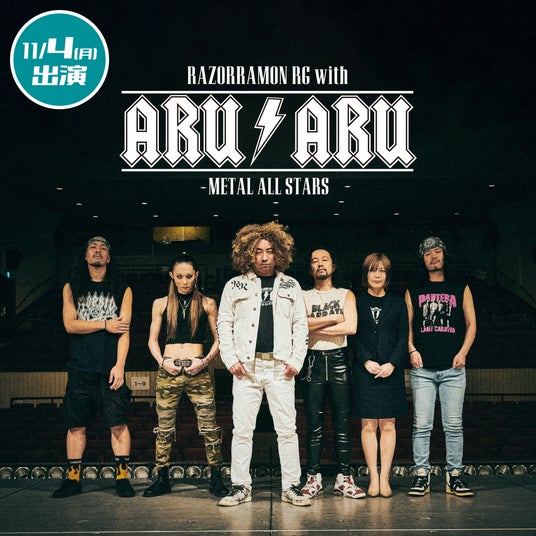 レイザーラモンRG with あるあるメタルオールスターズ(11/4)レイザーラモンRGとKuboty (ex. TOTALFAT) の声かけにより、KO-TA (SWANKY DANK)、MITSURU (Crystal Lake)、MAKI (ex. HER NAME IN BLOOD)、OLが集結し2019年に結成したメタルバンド。バンドが演奏する往年のメタルの名曲やメタルアレンジを加えたJ-POPの楽曲に、レイザーラモンRGが即興で「あるある」を乗せるスタイルが特徴。