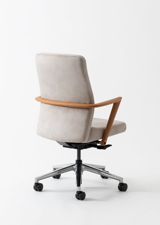 木製のアームが特徴的な新作の回転チェア。オフィスチェアに求められる機能性と木の手触りがもたらす安らぎを同時に叶えました。ローバックの他、ゆったりとしたハイバック仕様のバリエーションがあります。