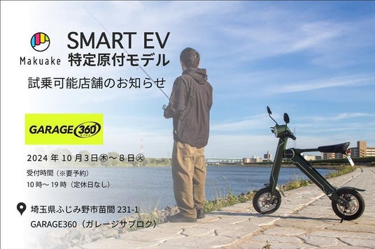 株式会社ブレイズ(愛知県名古屋市、代表取締役:市川秀幸、以下ブレイズ)は、Makuake応援購入プロジェクトにて先日発売した「16歳以上免許不要」の新商品:スマートEV 特定原付モデルが、弊社正規ディーラーの「GARAGE 360(ガレージサブロク)」(埼玉県ふじみ野市)にて、2024年10月3日(木)~8日(火)までご試乗いただけますことをお知らせいたします。