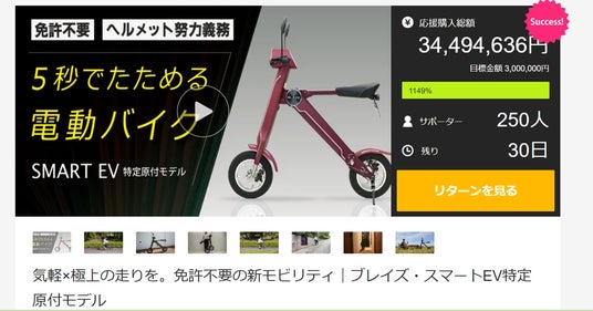 プロジェクトスタート1時間で目標金額を達成し、10月3日現在3,400万円を突破した注目の電動バイクとなっております。近郊にお住いのお客様におかれましては、ぜひこの機会に、「スマートEV特定原付モデル」をご体感ください!