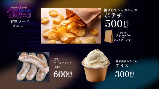 フードメニューも充実しており、お好きなフレーバーで楽しめるシャカシャカポテチや、三次市のジビエフランク、純米酒みわさくらを使ったアイスクリームの販売も行います。