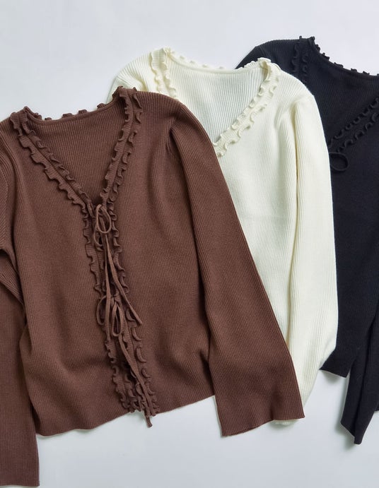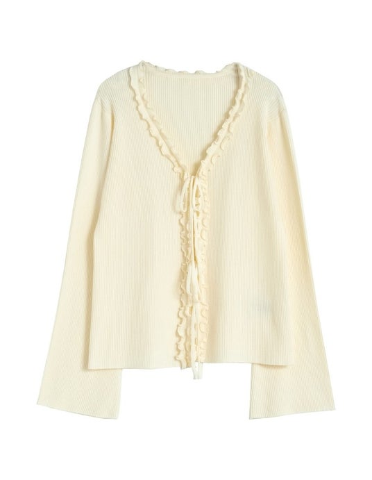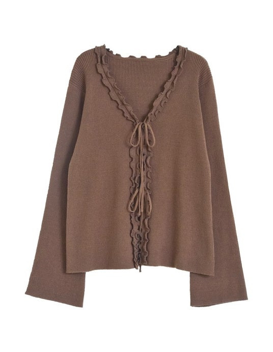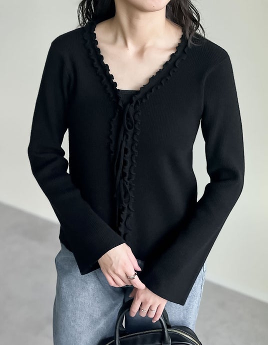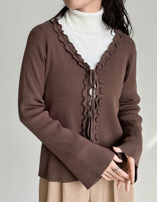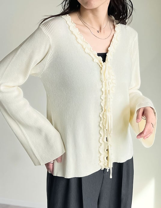 フェミニンな魅力を引き立てるリボンフリル付きのVネックリブニットカーディガン。