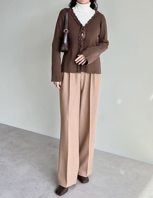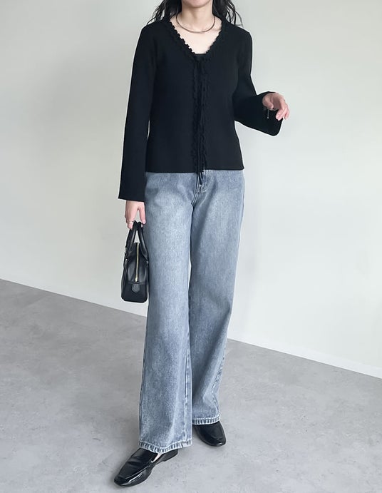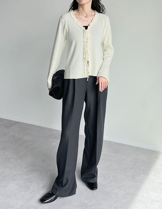トレンドのカーブパンツやスラックスパンツなどと合わせることで、フリルとリボンのディテールを生かしつつ、モード感のあるコーデも楽しめます。